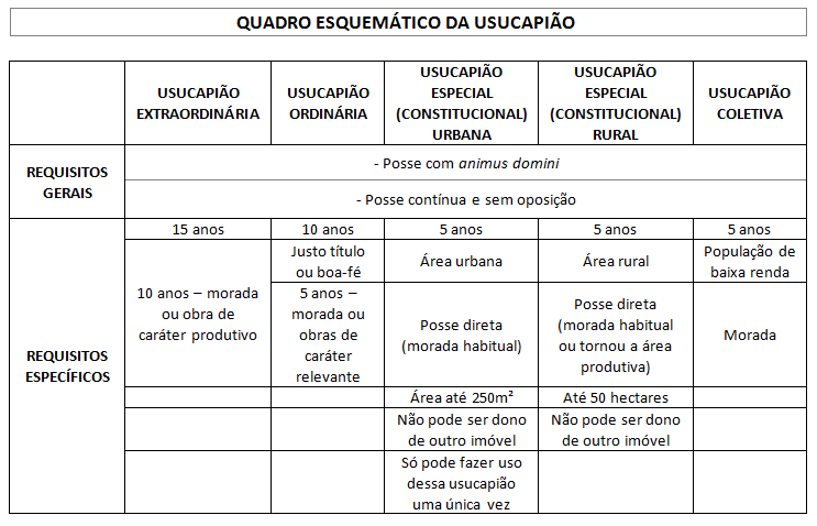 - Posse direta – morada habitual(nas outras espécies de usucapião o usucapiente pode, por exemplo, arrendar ou alugar o imóvel, nesta espécie de usucapião não pode!)