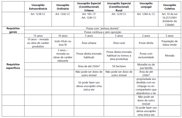 - Posse direta – morada habitual (nas outras espécies de usucapião o usucapiente pode, por exemplo, arrendar ou alugar o imóvel, nesta espécie de usucapião não pode!)
