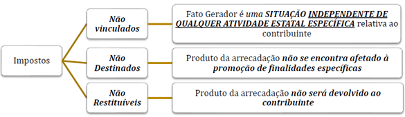 Os impostos são tributos não vinculados a uma atividade específica do Estado e são cobrados em razão da capacidade contributiva do sujeito passivo.